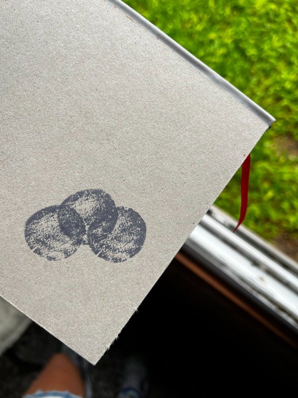 Libro cosido a mano, de 120 páginas. Tapa dura rústica en cartón gris, intervenido con sellos de goma por su propio autor.