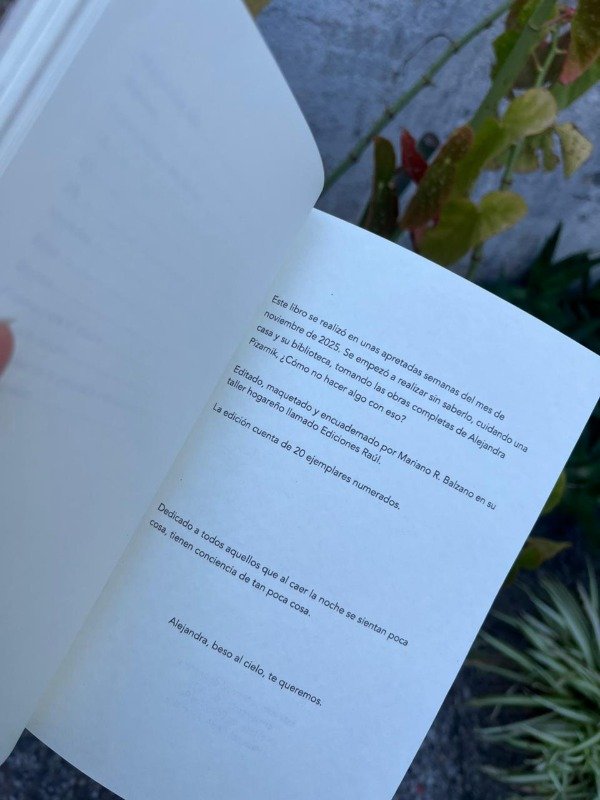 El proceso de selección de los textos fue práctico y caótico, o sencillamente caprichoso. De la lectura de las poesías completas de Pizarnik, ir marcando con lápiz, confiando en esa primera lectura, en esa primera intención. Confiando en que quedaron escritos preciosos afuera de este libro, escritos que descubrirá otra persona cuando haga su propia selección, con sus propias intuiciones, en su casa propia o prestada, en su propio patio, en su propio clima, en su propio ómnibus de larga distancia, en su propia llanura, con su propia infusión, en su propio río, con su propio silencio.